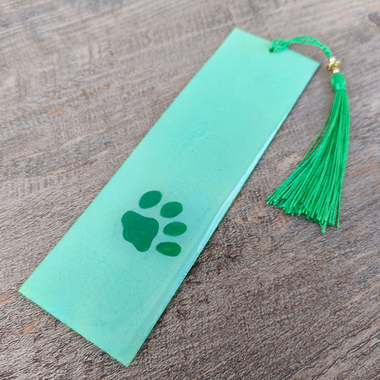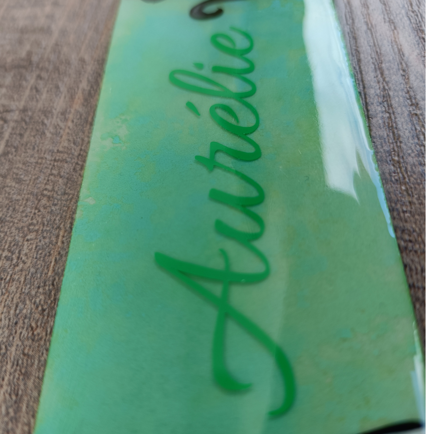 Sur un fond peint à la main, technique de peinture découpes et incrustation dans de la résine.